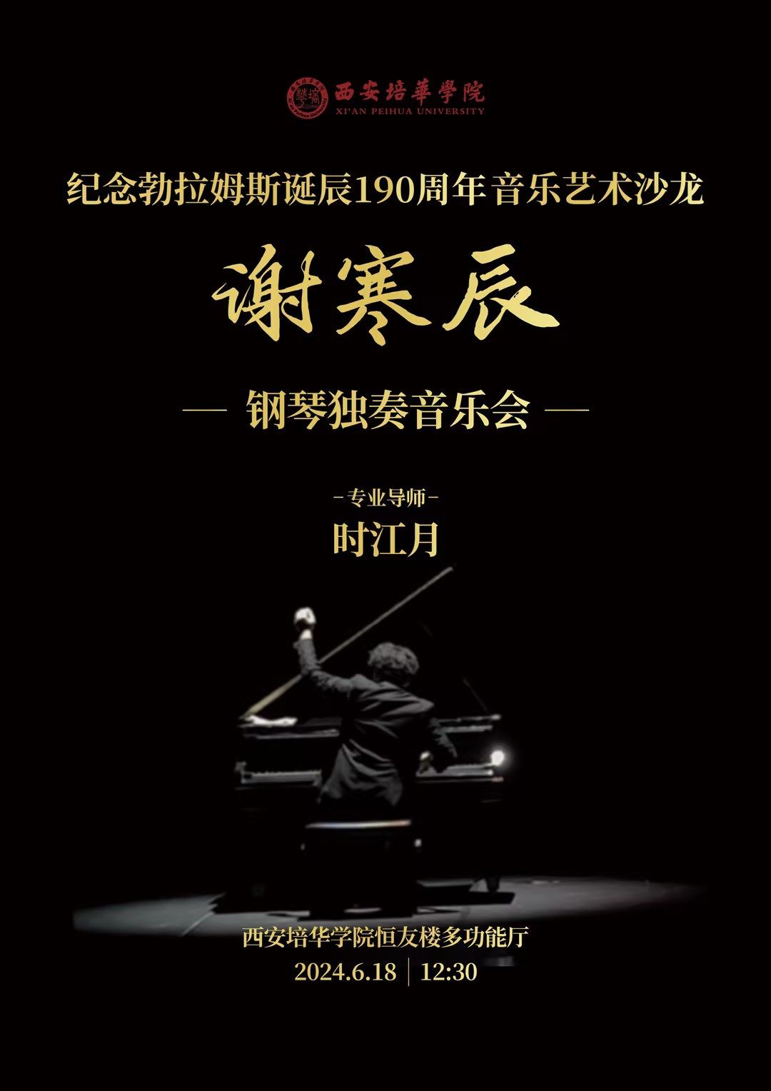 为落实美育浸润行动,丰富校园文化生活,6月18日,由西安艺术教育学会与西安钢琴协会共同主办,西安培华学院艺术教育中心承办的“纪念勃拉姆斯诞辰190周年音乐艺术沙龙——谢寒辰钢琴独奏音乐会”在恒友楼华美上演,学院艺术教育中心主任刘荣弟主持音乐会。