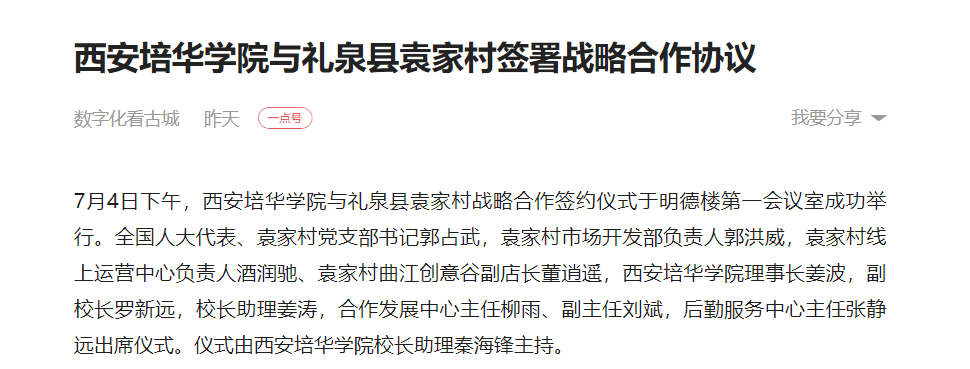 西安培华学院校长助理姜涛代表学校与袁家村村委会签约。姜波理事长向郭占武书记颁发聘书,聘请郭占武书记为西安培华学院乡村振兴研究院名誉院长。