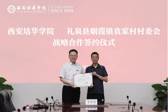 西安培华学院校长助理姜涛代表学校与袁家村村委会签约。姜波理事长向郭占武书记颁发聘书,聘请郭占武书记为西安培华学院乡村振兴研究院名誉院长。