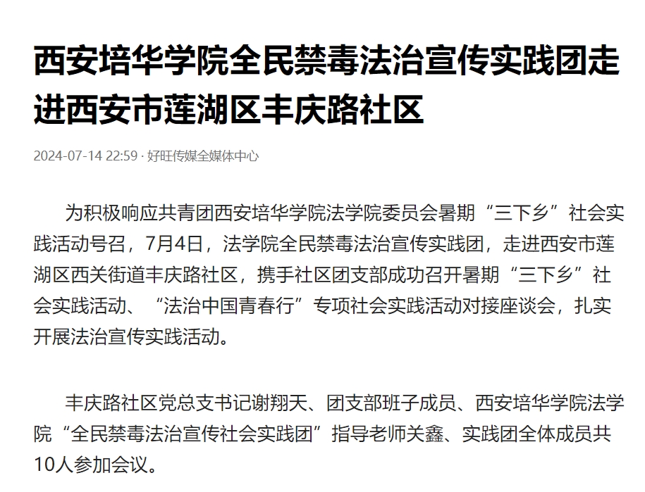 为积极响应共青团西安培华学院法学院委员会暑期“三下乡”社会实践活动号召,7月4日,法学院全民禁毒法治宣传实践团,走进西安市莲湖区西关街道丰庆路社区,携手社区团支部成功召开暑期“三下乡”社会实践活动、“法治中国青春行”专项社会实践活动对接座谈会,扎实开展法治宣传实践活动。