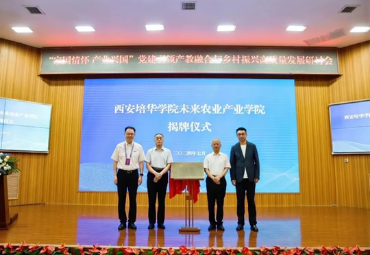 中央党校原副校长赵长茂,陕西省决咨委副主任、陕西社会主义学院院长、省政协原副主席李进权,西安培华学院理事长姜波,全国农村产业融合发展联盟路亚洲秘书长共同为西安培华学院未来农业产业学院揭牌