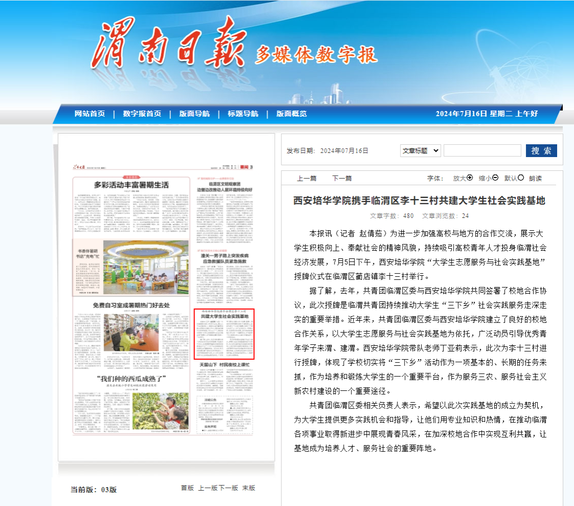为进一步加强高校与地方的合作交流,展示大学生积极向上、奉献社会的精神风貌,持续吸引高校青年人才投身临渭社会经济发展,7月5日下午,西安培华学院“大学生志愿服务与社会实践基地”授牌仪式在临渭区蔺店镇李十三村举行。