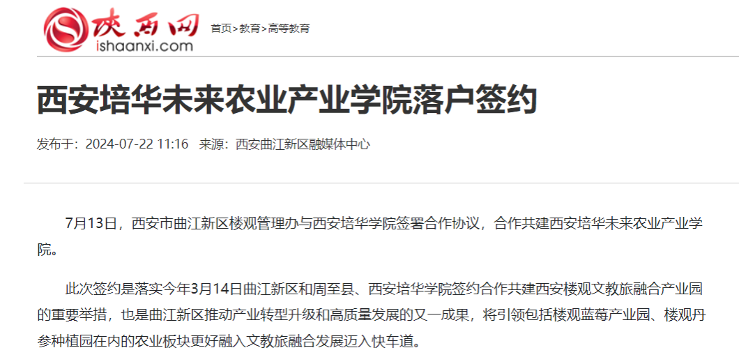 7月13日,曲江新区楼观管理办与西安培华学院签署合作协议,合作共建西安培华未来农业产业学院。