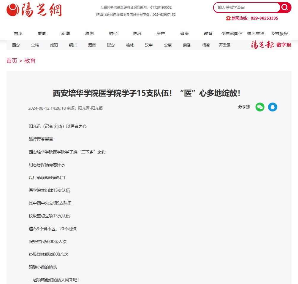 杏林使者志愿服务队成功入选2024年"投身乡村振兴,助力健康中国"团中央项目,赴陕西省西安市长安区东韦村儿童之家、榆林市榆阳区秦怀路街道等地,为当地儿童辅导作业、组织游戏互动、普及急救知识,深入了解需求,给予东韦村儿童之家的小朋友们温暖的情感支持;实地走访街道、开展宣讲调研、为不同社区提供测量血糖血压等服务,力所能及地解决群众关于健康保障的问题。通过16天的走访与义诊,杏林使者志愿服务队服务时长达80小时,累计服务185人,测量血压、血糖达105人,收获当地问卷调查47份,并获得了5份实践证明和2篇感谢信。此次实践,实践队发表了18篇新闻稿,其中国家级1篇、市级1篇、校级16篇。