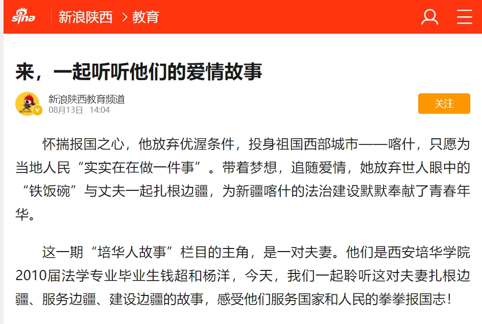 怀揣报国之心,他放弃优渥条件,投身祖国西部城市——喀什,只愿为当地人民“实实在在做一件事”。带着梦想,追随爱情,她放弃世人眼中的“铁饭碗”与丈夫一起扎根边疆,为新疆喀什的法治建设默默奉献了青春年华。