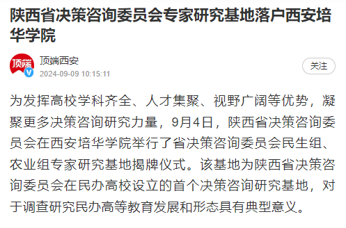 为发挥高校学科齐全、人才集聚、视野广阔等优势,凝聚更多决策咨询研究力量,9月4日,陕西省决策咨询委员会在西安培华学院举行了省决策咨询委员会民生组、农业组专家研究基地揭牌仪式。该基地为陕西省决策咨询委员会在民办高校设立的首个决策咨询研究基地,对于调查研究民办高等教育发展和形态具有典型意义。