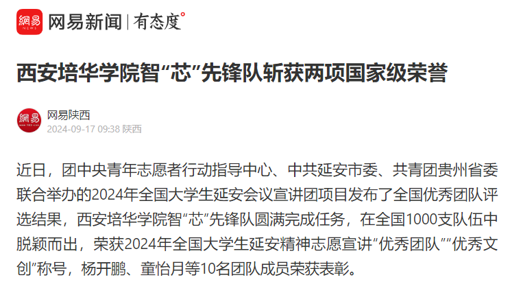 近日,团中央青年志愿者行动指导中心、中共延安市委、共青团贵州省委联合举办的2024年全国大学生延安会议宣讲团项目发布了全国优秀团队评选结果,西安培华学院智“芯”先锋队圆满完成任务,在全国1000支队伍中脱颖而出,荣获2024年全国大学生延安精神志愿宣讲“优秀团队”“优秀文创”称号,杨开鹏、童怡月等10名团队成员荣获表彰。