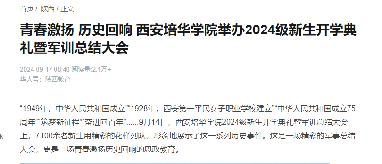 “1949年,中华人民共和国成立”“1928年,西安第一平民女子职业学校建立”“中华人民共和国成立75周年”“筑梦新征程”“奋进向百年”......9月14日,西安培华学院2024级新生开学典礼暨军训总结大会上,7100余名新生用精彩的花样列队,形象地展示了这一系列历史事件。这是一场精彩的军事总结大会,更是一场青春激扬历史回响的思政教育。