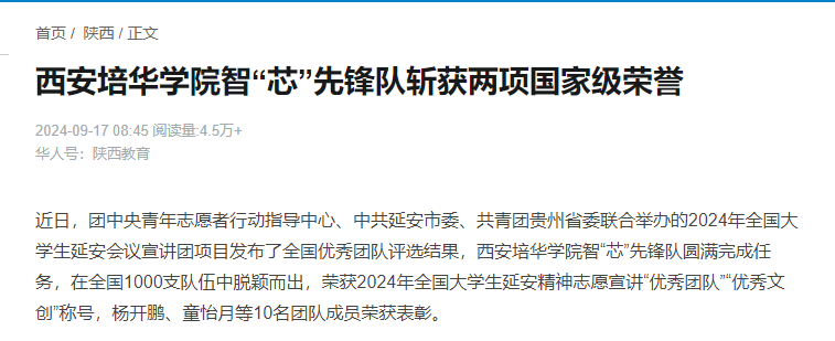 近日,团中央青年志愿者行动指导中心、中共延安市委、共青团贵州省委联合举办的2024年全国大学生延安会议宣讲团项目发布了全国优秀团队评选结果,西安培华学院智“芯”先锋队圆满完成任务,在全国1000支队伍中脱颖而出,荣获2024年全国大学生延安精神志愿宣讲“优秀团队”“优秀文创”称号,杨开鹏、童怡月等10名团队成员荣获表彰。