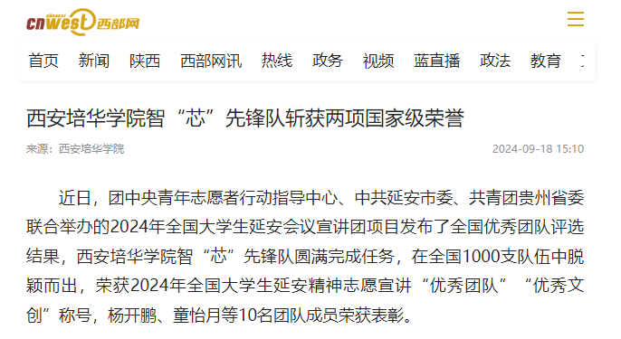 近日,团中央青年志愿者行动指导中心、中共延安市委、共青团贵州省委联合举办的2024年全国大学生延安会议宣讲团项目发布了全国优秀团队评选结果,西安培华学院智“芯”先锋队圆满完成任务,在全国1000支队伍中脱颖而出,荣获2024年全国大学生延安精神志愿宣讲“优秀团队”“优秀文创”称号,杨开鹏、童怡月等10名团队成员荣获表彰。