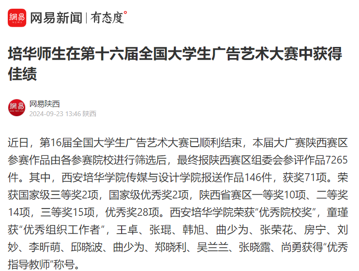 近日,第16届全国大学生广告艺术大赛已顺利结束,本届大广赛陕西赛区参赛作品由各参赛院校进行筛选后,最终报陕西赛区组委会参评作品7265件。其中,西安培华学院传媒与设计学院报送作品146件,获奖71项。荣获国家级三等奖2项,国家级优秀奖2项,陕西省赛区一等奖10项、二等奖14项,三等奖15项,优秀奖28项。西安培华学院荣获“优秀院校奖”,童瑾获“优秀组织工作者”,王卓、张琨、韩旭、曲少为、张荣花、房宁、刘妙、李昕萌、邱晓波、曲少为、郑晓利、吴兰兰、张晓露、尚勇获得“优秀指导教师”称号。