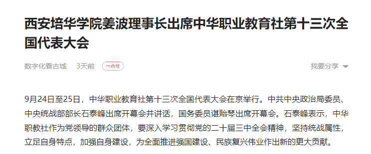 9月24日至25日,中华职业教育社第十三次全国代表大会在京举行。中共中央政治局委员、中央统战部部长石泰峰出席开幕会并讲话,国务委员谌贻琴出席开幕会。石泰峰表示,中华职教社作为党领导的群众团体,要深入学习贯彻党的二十届三中全会精神,坚持统战属性,立足自身特点,加强自身建设,为全面推进强国建设、民族复兴伟业作出新的更大贡献。