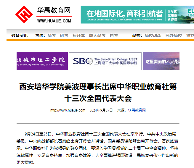 9月24日至25日,中华职业教育社第十三次全国代表大会在京举行。中共中央政治局委员、中央统战部部长石泰峰出席开幕会并讲话,国务委员谌贻琴出席开幕会。石泰峰表示,中华职教社作为党领导的群众团体,要深入学习贯彻党的二十届三中全会精神,坚持统战属性,立足自身特点,加强自身建设,为全面推进强国建设、民族复兴伟业作出新的更大贡献。