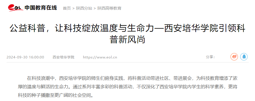 为了践行“弘扬科学家精神,激发全社会创新活力”的使命,西安培华学院积极参与并组织了一系列群众性科普活动。