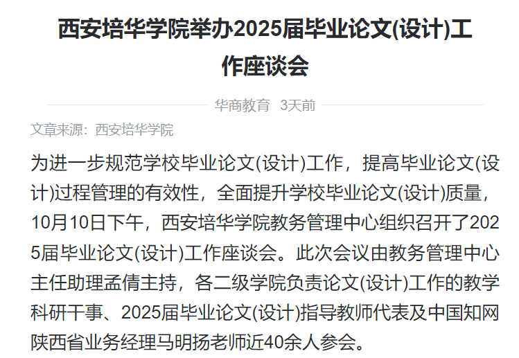 为进一步规范学校毕业论文(设计)工作,提高毕业论文(设计)过程管理的有效性,全面提升学校毕业论文(设计)质量,10月10日下午,西安培华学院教务管理中心组织召开了2025届毕业论文(设计)工作座谈会。此次会议由教务管理中心主任助理孟倩主持,各二级学院负责论文(设计)工作的教学科研干事、2025届毕业论文(设计)指导教师代表及中国知网陕西省业务经理马明扬老师近40余人参会。