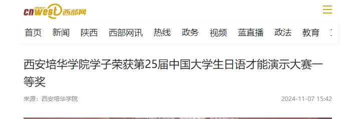 11月2日,第25届中国大学生日语才能演示大赛在西安外国语大学长安校区举行。西安培华学院人文与国际教育学院外语系日语专业2022级王静怡同学获得一等奖,并获得受邀访问日本的机会,小泽一博老师获优秀指导奖。西安培华学院获最优秀院校奖。