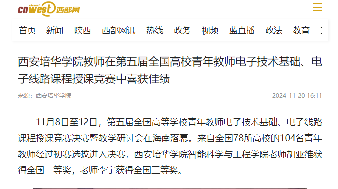 11月8日至12日,第五届全国高等学校青年教师电子技术基础、电子线路课程授课竞赛决赛暨教学研讨会在海南落幕。来自全国78所高校的104名青年教师经过初赛选拔进入决赛,西安培华学院智能科学与工程学院老师胡亚维获得全国二等奖,老师李宇获得全国三等奖。