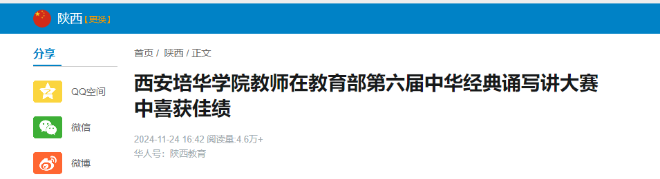 此次获奖不仅是对教师个人专业能力的肯定,也是对学校教学工作和文化传承的鼓励。一直以来,西安培华学院高度重视教师专业技能的培养,通过举办各种形式的诵读比赛和教学研讨活动,不断提升教师的教学水平。下一步,培华将继续坚持立德树人根本任务,以传承和弘扬中华优秀传统文化为己任,提升教师专业素养和教学能力,培养更多的优秀青年教师,为地区教育事业的发展做出更大贡献。