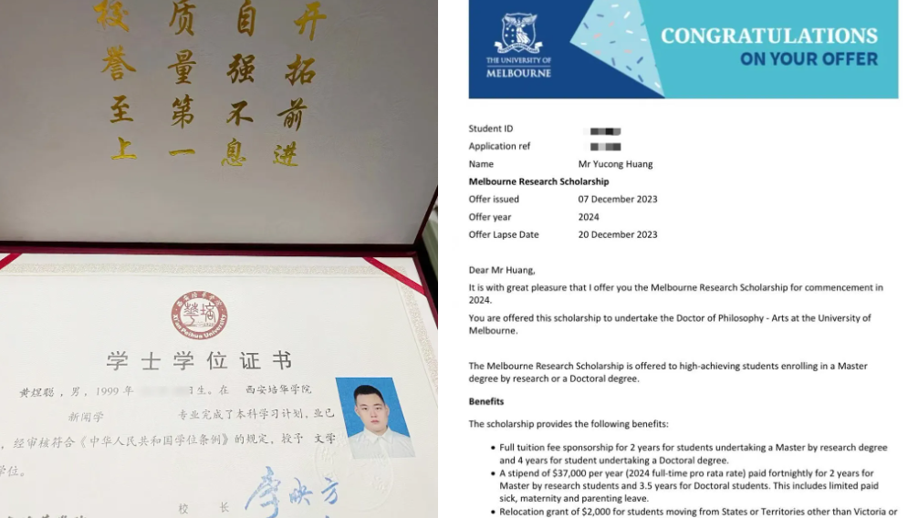 西安培华学院的学位证书和墨尔本大学博士项目的全额科研奖学金录取通知书