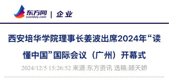 西安培华学院理事长姜波受邀参加了2024年“读懂中国”国际会议(广州)开幕式,并在“全人类共同价值和文明互鉴”研讨会上发言。姜波理事长是西安培华学院的举办人、理事长,也是世界华人协会副会长、世界华商投资基金会名誉会长,作为高等教育工作者在大会上和大家分享交流在文化和教育方面的研习体会。世界华人协会常务副会长、世界华商投资基金会创会主席马兴利博士与中国国际新媒体传播集团主席、华夏宗亲联谊会荣誉会长陈政峰先生世界杰出华人青年企业家盘玉博士陪同姜波理事长一同出席。