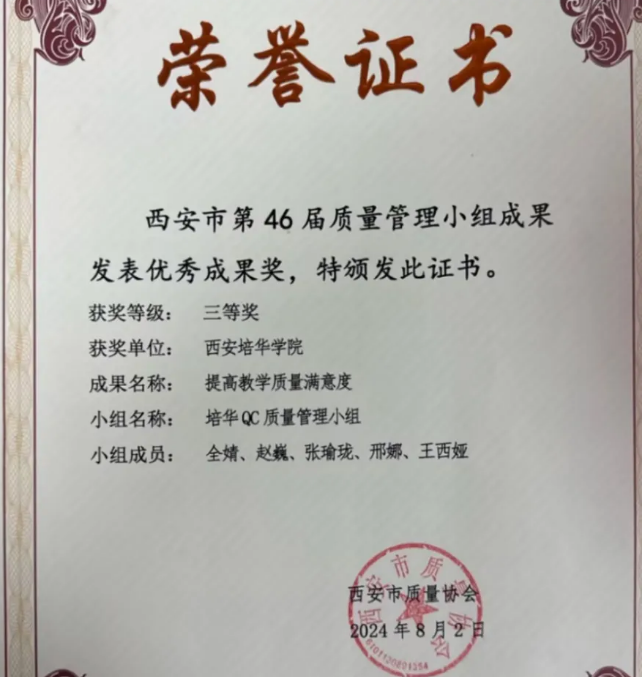 西安培华学院QC质量管理小组荣获“西安市第46届质量管理小组优秀成果奖”