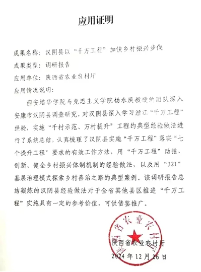近日,陕西省政府领导对省社科联报送的《陕西社科要报》2024年第14期作出肯定性批示。第14期《汉阴县以“千万工程”加快乡村振兴步伐》为西安培华学院杨永庚、陈倩、陈欢、胡倩等教师团队的研究成果。