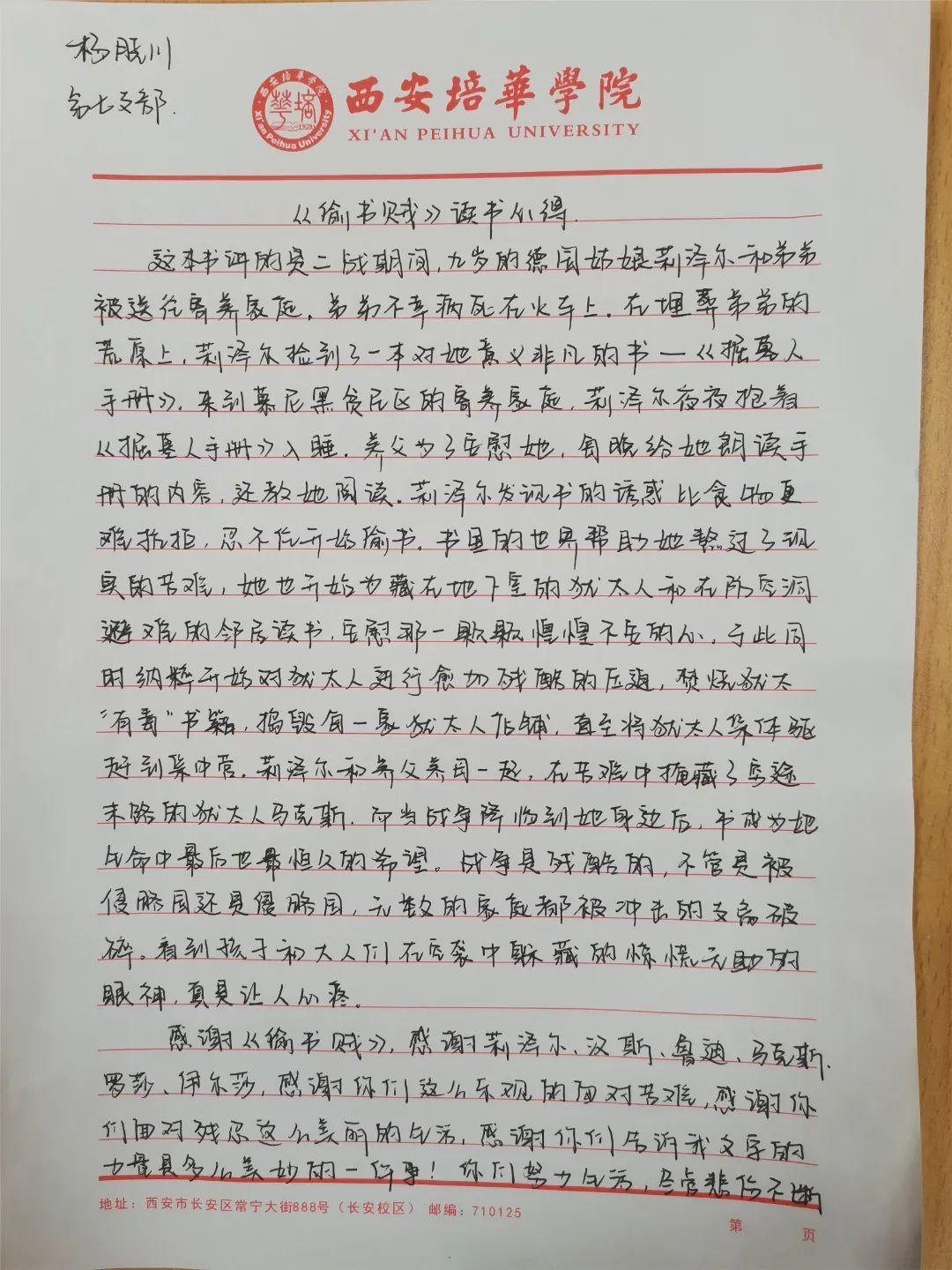 为深入传承中华优秀传统文化,提升自我修养,推进“书香培华”品牌特色的校园文化建设,教育引导学生从中华优秀传统文化中汲取营养和奋进动力。前不久,西安培华学院会计与金融学院党委在各学生支部成员内广泛开展“阅读经典、书香培华”主题读书分享会活动,以达到营造积极向上、健康文明的校园文化氛围。此次“阅读经典、书香培华”读书分享会设立一等奖、二等奖、三等奖及优秀奖,活动形式主要通过写读书笔记或读书心得来分享自己的阅读感受。各学生支部积极参与,踊跃报名,收到了丰富多彩,形式多样的读书笔记,本次活动最终评选出一等奖1名、二等奖3名、三等奖5名、优秀奖10名,选取了部分佳作向大家展示,让我们一起来看看吧!
