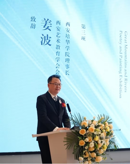 西安培华学院理事长、西安艺术教育学会会长姜波作为诗画展指导单位致辞