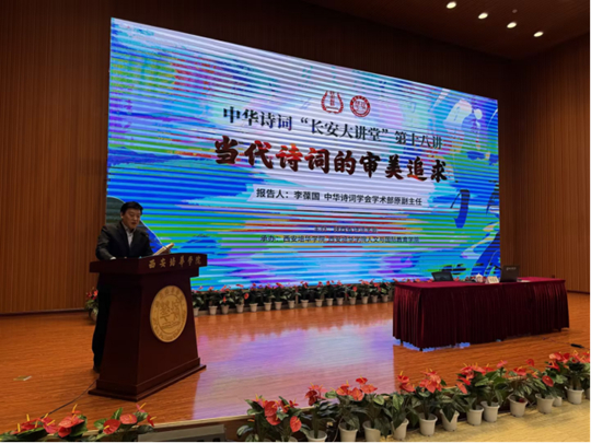 2025年3月15日,由陕西省诗词学会主办,西安培华学院及人文与国际教育学院承办的中华诗词“长安大讲堂”第十八讲,在西安培华学院维之图书馆报告厅圆满举行。本次讲座聚焦“当代诗词的审美追求”,特邀中华诗词学会学术部原副主任李葆国先生担纲主讲。来自全国各地的诗词爱好者、西安培华学院人文与国际教育学院中文系全体教师以及部分学生,共计400余人齐聚一堂,共享这场诗词盛宴。