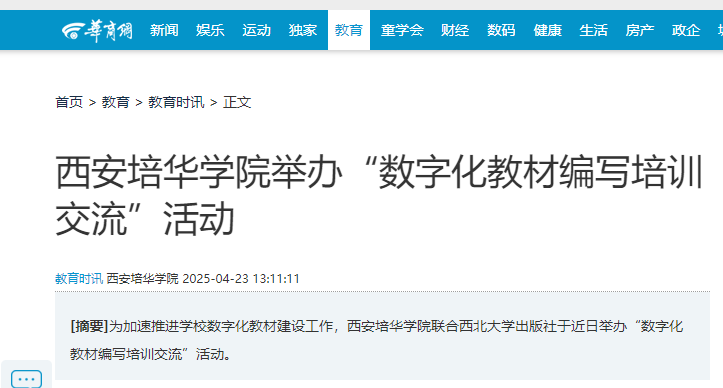 为深入贯彻党的二十大报告“推进教育数字化”战略部署,加速推进学校数字化教材建设工作,西安培华学院联合西北大学出版社于近日举办“数字化教材编写培训交流”活动。西北大学出版社副总编柴洁、数字出版部主任强薇、数字编辑杨皓轶及少儿与学前编辑部主任第明等出版领域专家,与培华师生代表共聚一堂,围绕数字教材建设的核心环节展开深度探讨。活动由教务管理中心主任助理孟倩主持。