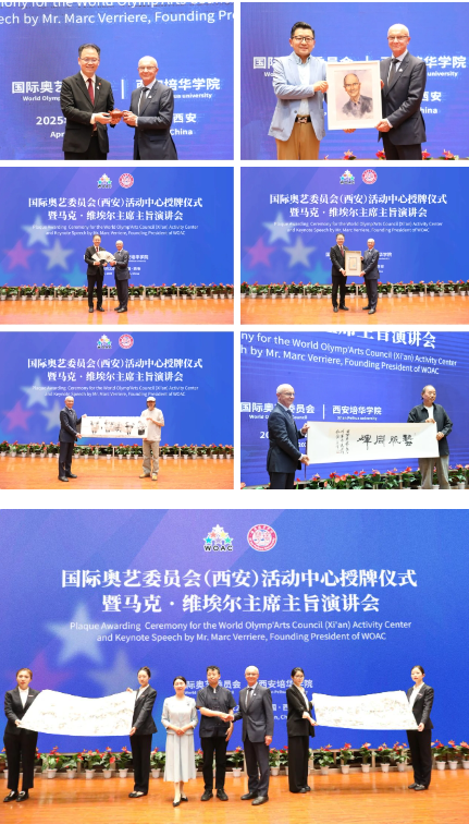 会上,西安培华学院理事长、陕西省中国画研究院理事长姜波,中国美术家协会会员、陕西省美协水彩画艺委会副主任、民盟中央美术院陕西分院理事宋清,中国美协陕西创作中心副秘书长、美中油画雕塑院副院长、陕西省文史研究馆研究员周起翔,陕西省油画院院长薛亚泽相继为国际奥艺委员会赠送艺术作品,用艺术架起沟通的桥梁。