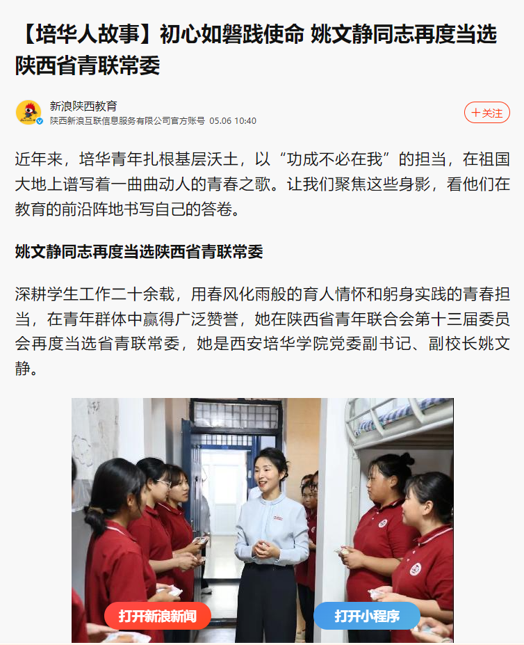 近日,陕西省青年联合会第十三届委员会全体会议在西安举行,会议选举产生了陕西省青年联合会新一届领导机构,西安培华学院党委副书记、副校长姚文静再度当选陕西省青联常委。