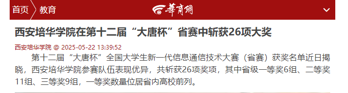 第十二届“大唐杯”全国大学生新一代信息通信技术大赛(省赛)获奖名单近日揭晓,西安培华学院参赛队伍表现优异,共斩获26项奖项,其中省级一等奖6组、二等奖11组、三等奖9组,一等奖数量位居省内高校前列。