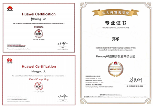 近三年,数据科学与大数据技术专业以产教融合为抓手,系统推进学生专业资质认证与创新能力培养,取得显著育人成果:行业资质认证方面,累计组织48人次考取华为技术认证体系证书,覆盖大数据、人工智能、云计算及鸿蒙开发四大技术方向,其中2人通过华为HCCDP高级工程师认证;43人获得深信服云计算认证工程师资质;21人取得工业和信息化部人才交流中心颁发的大数据技术应用(初级)职业能力证书,形成多维度技术认证矩阵。学科竞赛与科研创新实现突破性进展,累计获得全国大学生计算机设计大赛、统计建模大赛等国家级A类赛事奖项90余人次;获批国家级大学生创新创业训练计划项目6项,部分成果发表于核心期刊并落地企业应用。