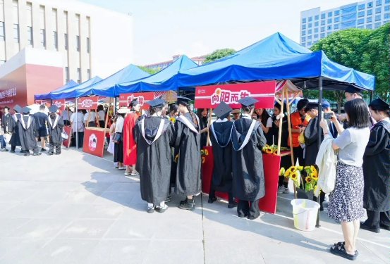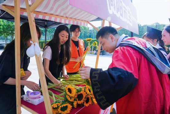 学子们接过学位证,变戏法般捧出竹编小篮,红桃黄李卧在绶带金穗间,寓意“桃李不言,下自成蹊”的育人传奇。