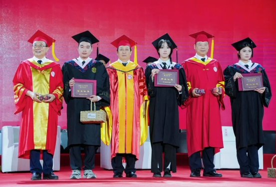 姜波理事长携校领导们,共同为优秀毕业生代表颁奖,西部计划志愿者整装齐备,怀揣理想踏上征途,向着辽阔远方进发;应征入伍者肩披荣耀绶带,眉宇间彰显着深厚的家国情怀;考研成功的学子紧握通知书,眼前铺展开璀璨的学术星途……