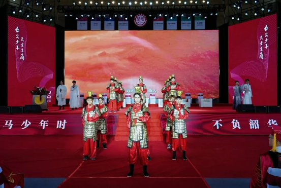 典礼在音诗画情景表演《七律·毕业季——过秦俑有寄》中拉开序幕。悠扬的旋律在空中飘荡,深情的朗诵直击心灵,与舞台上充满张力的画面完美交融,将百年培华的厚重底蕴与当代青年的蓬勃朝气巧妙联结。秦俑静默,仿佛在诉说着:长安少年,自古便是历史长河中熠熠生辉的主角!