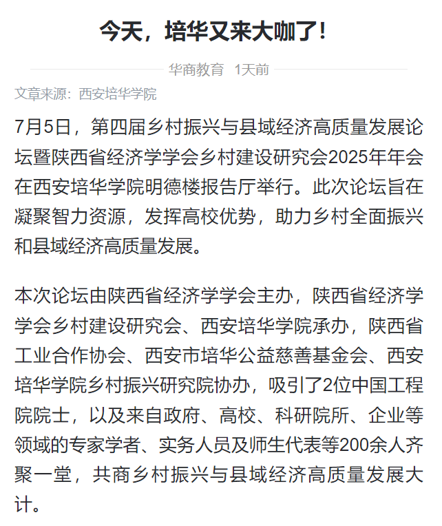 7月5日,第四届乡村振兴与县域经济高质量发展论坛暨陕西省经济学学会乡村建设研究会2025年年会在西安培华学院明德楼报告厅举行。此次论坛旨在凝聚智力资源,发挥高校优势,助力乡村全面振兴和县域经济高质量发展。