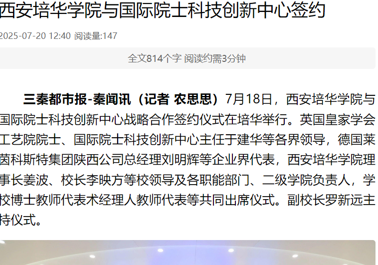 仪式上,西安培华学院校长李映方分别与国际院士科技创新中心副主任赵文杰、德国莱茵科斯特集团陕西公司总经理刘明辉签署战略合作协议。国际院士科技创新中心代表陈登奇、王鼎、赵泽阳,陕西省高校技术转移中心主任田鹏,长安区科技创新中心主任赵鹏等十余位嘉宾现场见证。此次合作聚焦人才培养、科研创新与成果转化,旨在打造“产学研用”一体化平台,为区域经济高质量发展注入新动能。