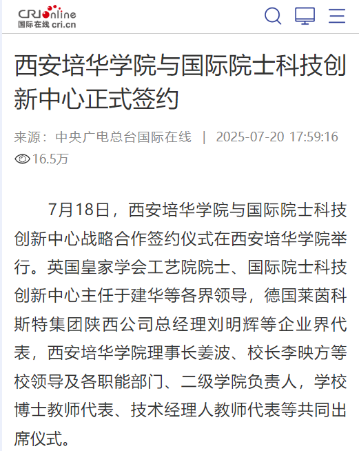 据悉,作为中华职业教育社在陕西省的唯一延续学校,西安培华学院始终积极践行“手脑并用”“做学合一”的职教理念,将深化产教融合、校企合作作为立校之本与发展引擎。多年来,通过精准对接区域产业发展需求,培华学院在引育高端人才和搭建育人平台方面取得了显著成效。一方面,学校大力实施“人才强校”战略,已成功引进包括6位两院院士及国际知名院士在内的顶尖学者加盟,为学科建设、科研攻关和高水平人才培养注入了强大的智力支撑。另一方面,学校积极探索协同育人新模式,聚焦重点产业领域,联合行业领军企业,已高质量建成并投入运行12个特色鲜明的现代产业学院。