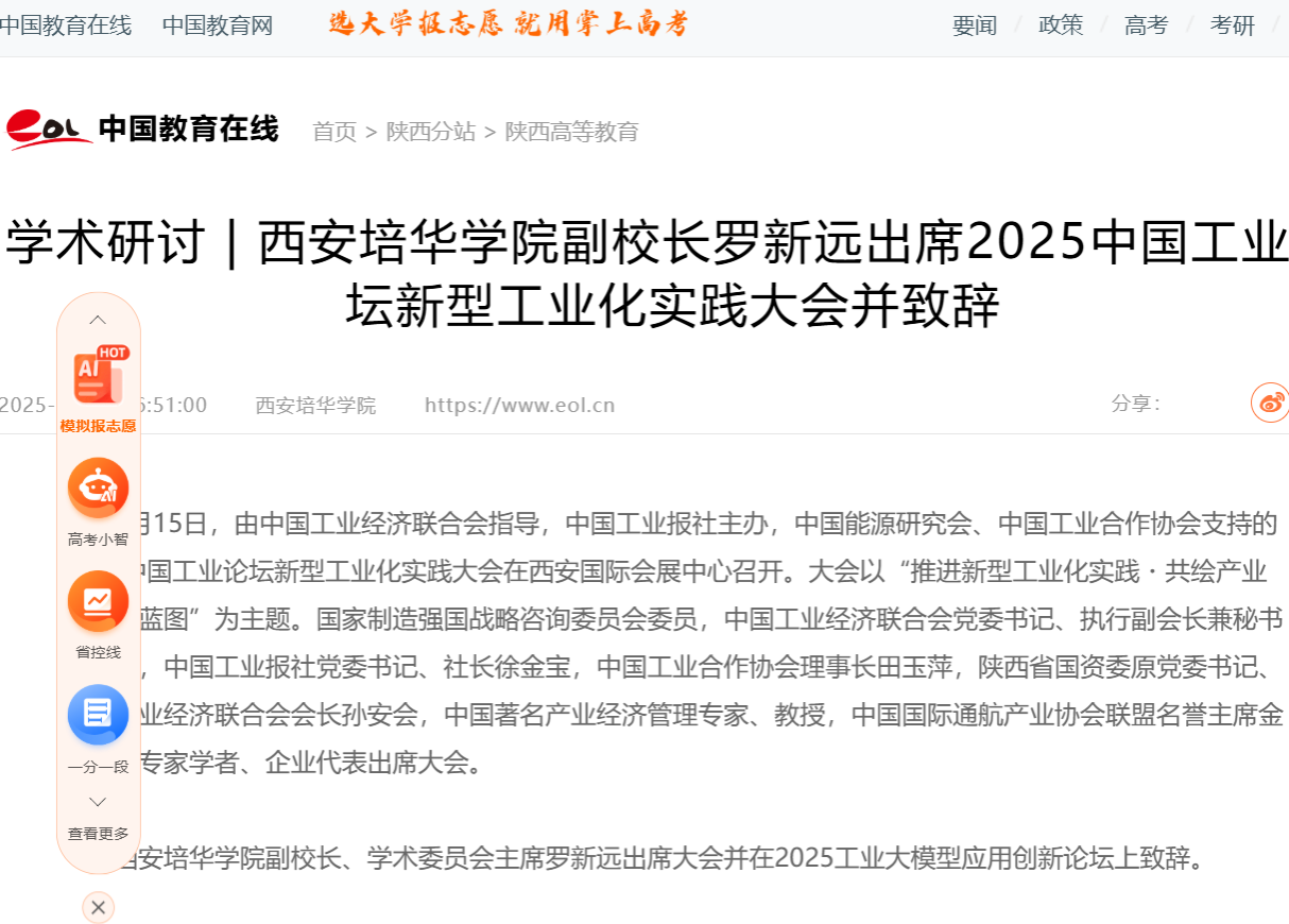 他表示,在AI大模型等前沿技术深刻变革工业的时代背景下,高校的人才培养体系、学科专业结构、科研组织模式乃至师资能力建设,正在进行深刻变革与重塑。西安培华学院通过“对接产业需求,优化专业布局”“共建协同平台,创新育人模式”“强化师资双能,提升服务能力”“营造创新生态,激发学生潜能”这四项重点工作,深化产教融合和科教融汇。