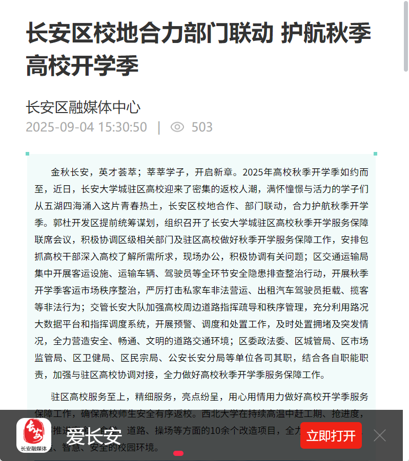 金秋长安,英才荟萃;莘莘学子,开启新章。2025年高校秋季开学季如约而至,近日,长安大学城驻区高校迎来了密集的返校人潮,满怀憧憬与活力的学子们从五湖四海涌入这片青春热土,长安区校地合作、部门联动,合力护航秋季开学季。郭杜开发区提前统筹谋划,组织召开了长安大学城驻区高校秋季开学服务保障联席会议,积极协调区级相关部门及驻区高校做好秋季开学服务保障工作,安排包抓高校干部深入高校了解所需所求,现场办公,积极协调有关问题;区交通运输局集中开展客运设施、运输车辆、驾驶员等全环节安全隐患排查整治行动,开展秋季开学季客运市场秩序整治,严厉打击私家车非法营运、出租汽车驾驶员拒载、揽客等非法行为;交管长安大队加强高校周边道路指挥疏导和秩序管理,充分利用路况大数据平台和指挥调度系统,开展预警、调度和处置工作,及时处置拥堵及突发情况,全力营造安全、畅通、文明的道路交通环境;区委政法委、区城管局、区市场监管局、区卫健局、区民宗局、公安长安分局等单位各司其职,结合各自职能职责,加强与驻区高校协调对接,全力做好高校秋季开学季服务保障工作。