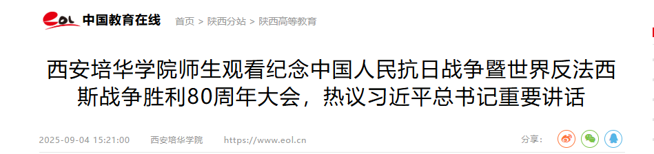 9月3日,纪念中国人民抗日战争暨世界反法西斯战争胜利80周年大会在北京天安门广场隆重举行。西安培华学院组织师生代表通过多种方式收看了大会直播盛况,共同见证了这一具有重大历史意义的时刻。