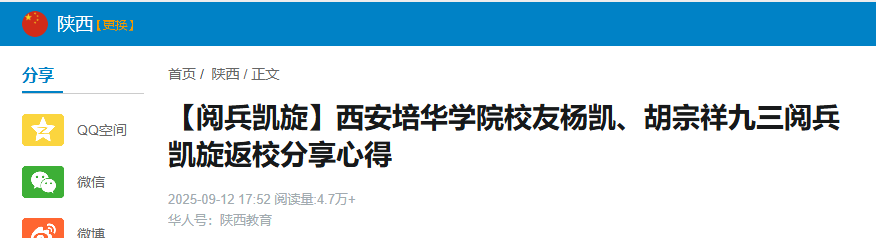 初秋的培华校园丹桂飘香、阵阵秋雨送来丝丝凉爽。9月11日清晨,西安培华学院校园内电子屏“热烈欢迎杨凯、胡宗祥参加九三阅兵凯旋归来”格外耀眼。刚刚参加完“九三阅兵”的2022届校友杨凯、2024届校友胡宗祥身着笔挺戎装返回母校,与师长和学弟学妹分享成长经历。