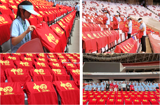 由培华志愿者精心布置的“红色海洋”成为赛场又一亮点。赛前,志愿者们分组将红色助威服整齐摆放在6万座席上;比赛间隙,引导观众穿戴助威服,带动全场形成红色视觉矩阵,与赛场内的国旗和加油标语相呼应,成为央视转播画面中的经典场景。