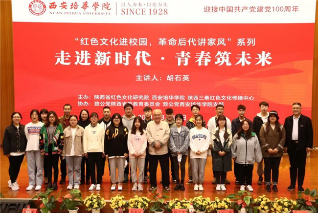 3月17日,由陕西省红色文化研究院、西安培华学院、陕西三秦红色文化传播中心主办,致公党陕西省委教育委员会,致公党西安培华学院支部协办的迎接建党100周年,“红色文化进校园,革命后代讲家风”系列活动在西安培华学院长安校区举行,本次活动邀请胡乔木同志之子、西安培华学院名誉校长胡石英为青年学子以《走进新时代,青春筑未来》主题讲述创新与梦想。活动由西安培华学院党委书记罗新远教授主持,陕西省红色文化研究院、致公党陕西省委教育委员会、致公党西安培华学院支部、曲江新区总支部代表以及培华师生聆听了报告。