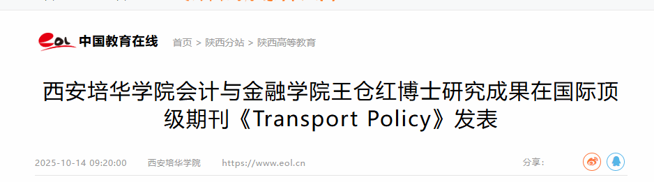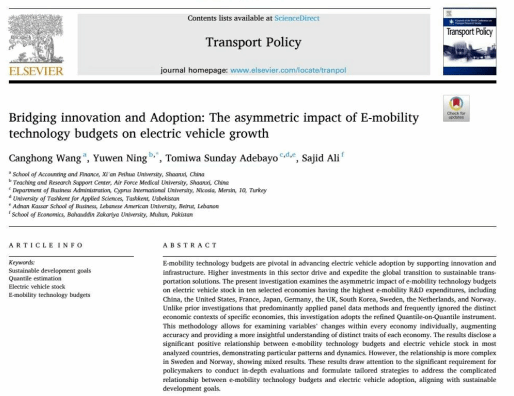 近日,西安培华学院会计与金融学院王仓红博士作为第一作者、学院为第一署名单位的研究成果《Bridging innovation and Adoption: The asymmetric impact of E-mobility technology budgets on electric vehicle growth》在SSCI收录的国际学术期刊《Transport Policy》正式发表。该期刊位列JCR分区一区、中国科学院分区一区Top期刊,2025年影响因子5.3分。