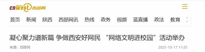 为激励广大网民自觉提升网络素养,善用网络传播正能量,以理性之声、青春之笔,共同描绘西安文明形象,争做有责任感、有法治意识、有奉献精神的西安好网民,10月16日下午,由西安市委网信办主办,长安区委网信办、西安培华学院、陕西广电融媒体集团起点新闻(西部网)联合承办的“网络文明进校园 学子同心树新风”——2025 争做西安好网民工程活动在西安培华学院举行。