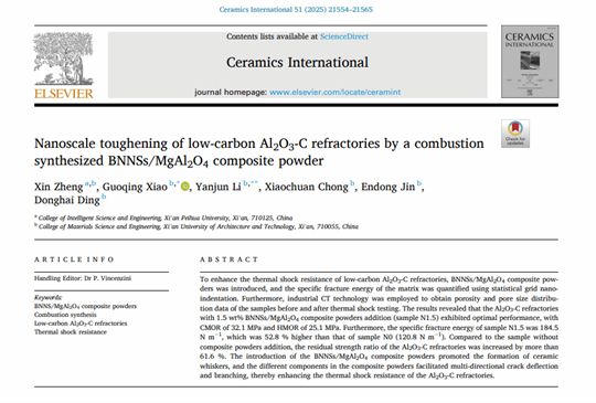 在深耕材料科学领域五年的时间中,她的成果不断获得行业认可。让郑欣倍感温暖与鼓舞的是,加入培华后,学校对科研工作给予了全力支持,为她搭建了施展专业才华的广阔舞台。今年带领团队在国际材料领域SCIE期刊《Ceramics International》发表题为《Nanoscale toughening of low-carbon Al₂O₃-C refractories by a combustion synthesized BNNSs/MgAl₂O₄ composite powder》的学术论文。这一期刊创刊于1971年,由Elsevier Ltd出版,在中国科学院分区中属材料科学大类2区,为材料科学权威Top期刊,影响因子5.6,是国际公认的材料科学权威刊物之一。