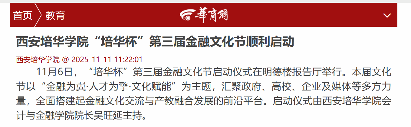“培华杯”金融文化节是西安培华学院会计与金融学院的品牌活动,本届文化节将开展“金融艺术家进校园”公益展演、金融消费者权益保护宣传、防范AI诈骗校园宣传、“传承红色金融基因,培育中国特色金融文化”主题讲座、产教融合校企合作高质量发展研讨会等系列活动,持续营造浓厚的金融文化氛围,全面提升学生的综合素养与实践能力。